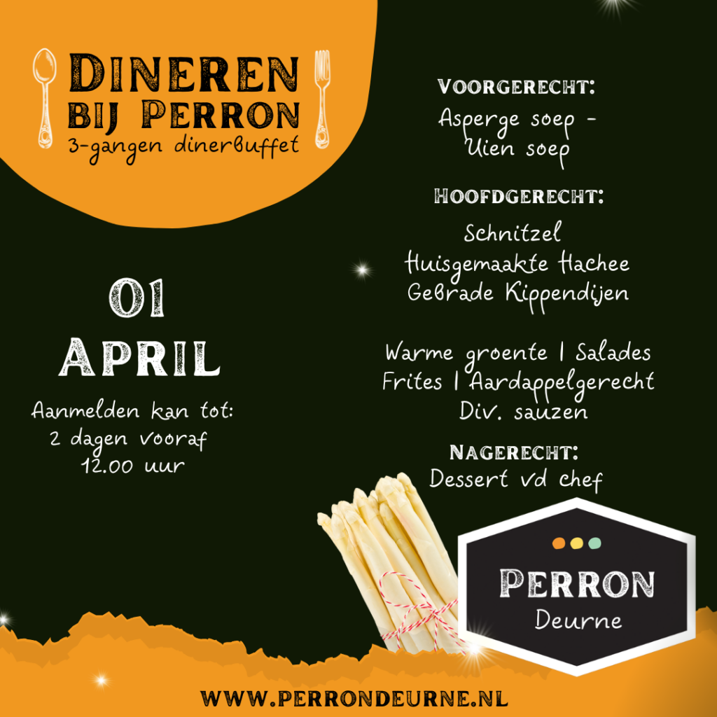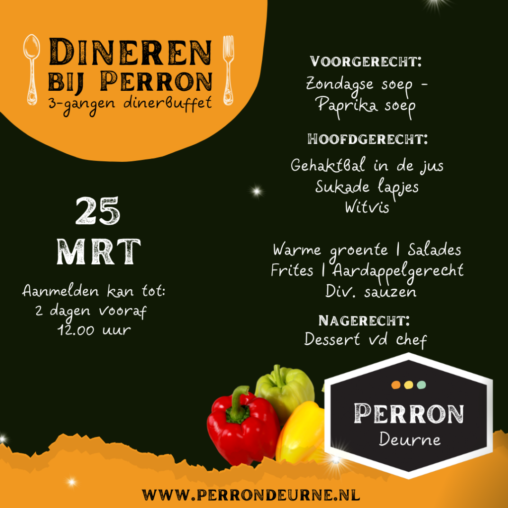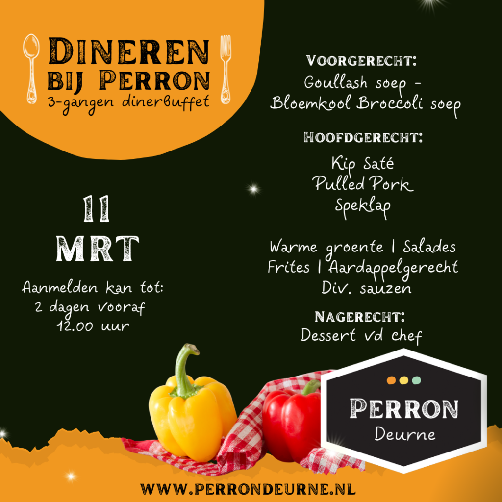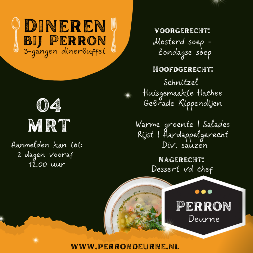 We begonnen dit concept met de focus op ouderen, maar door de groeiende vraag vanuit een jonger publiek hebben we de aanvangstijd verplaatst naar 18.00 uur. Zo kunnen ook werkenden gemakkelijker aanschuiven. Onder de naam “Dineren bij Perron” bieden we een heerlijk driegangenmenu in buffetvorm voor slechts €20.