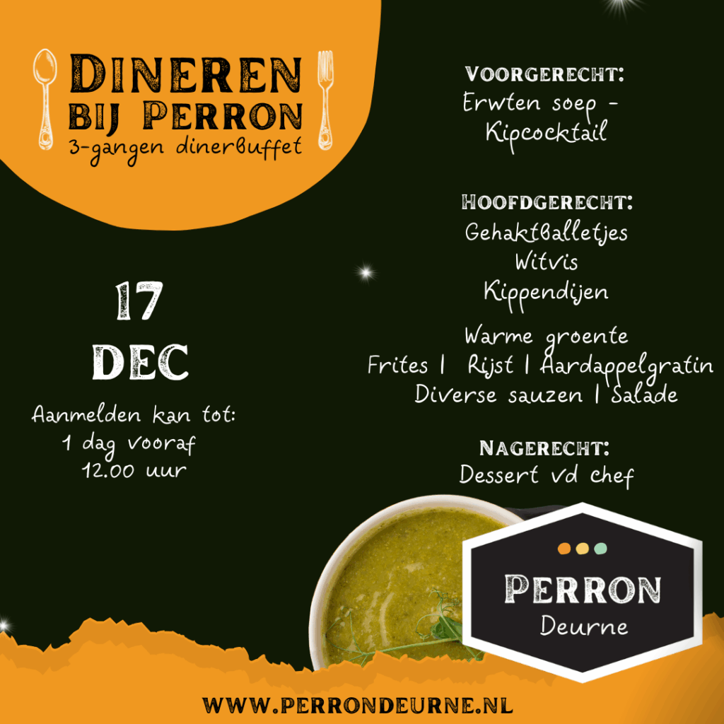 We begonnen dit concept met de focus op ouderen, maar door de groeiende vraag vanuit een jonger publiek hebben we de aanvangstijd verplaatst naar 18.00 uur. Zo kunnen ook werkenden gemakkelijker aanschuiven. Onder de naam “Dineren bij Perron” bieden we een heerlijk driegangenmenu in buffetvorm voor slechts €20.